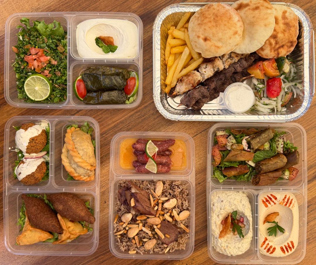 Taboulé, Fattouche, Labné , Homos, Babaganouge, Warak Enab Atteh (feuilles de vigne aux légumes), Variétés Salées (kibbi boule, fatayers viande et légumes), Falafils, MAKANEK (saucisses) ou Sojok (merguez), Mouton farci à l’orientale, Mixed Grill (brochettes kafta, taouk, filet accompagnees de frites, oignons, persil et aioli), pain libanais.